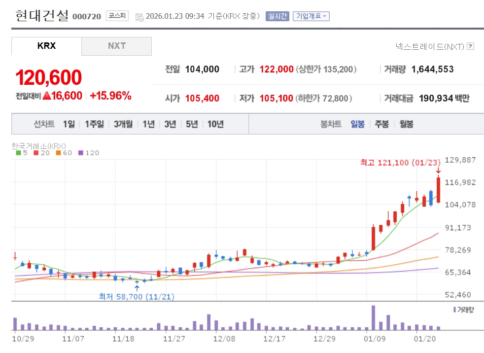 이미지 확대보기23일 한국거래소에 따르면 이날 오전 9시 34분 기준 현대건설은 전 거래일 대비 15.96% 오른 12만600원에 거래되고 있다.