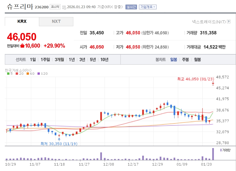 이미지 확대보기23일 한국거래소에 따르면 오전 9시 40분 현재 슈프리마는 전 거래일보다 29.90% 오른 4만 6050원에 거래중이다.