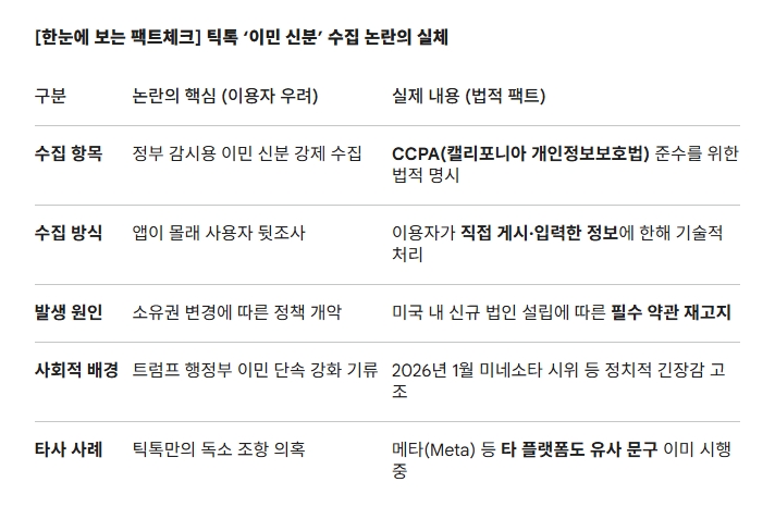 이미지 확대보기테크크런치(TechCrunch)가 지난 23일(현지시간) 보도한 내용에 따르면, 이번 논란은 틱톡의 미국 내 소유 구조 변경에 따른 필수 알림 과정에서 이용자들이 평소 무심코 지나치던 약관 세부 내용을 확인하며 발생했다. 6하 원칙에 따라 분석하면, 지난 23일 미국 전역에서 틱톡 이용자들이 업데이트된 프라이버시 정책 속 ‘민감 정보’ 항목을 발견하고 정부 감시 가능성을 우려하며 계정 삭제 등 집단행동에 나선 모습이다.