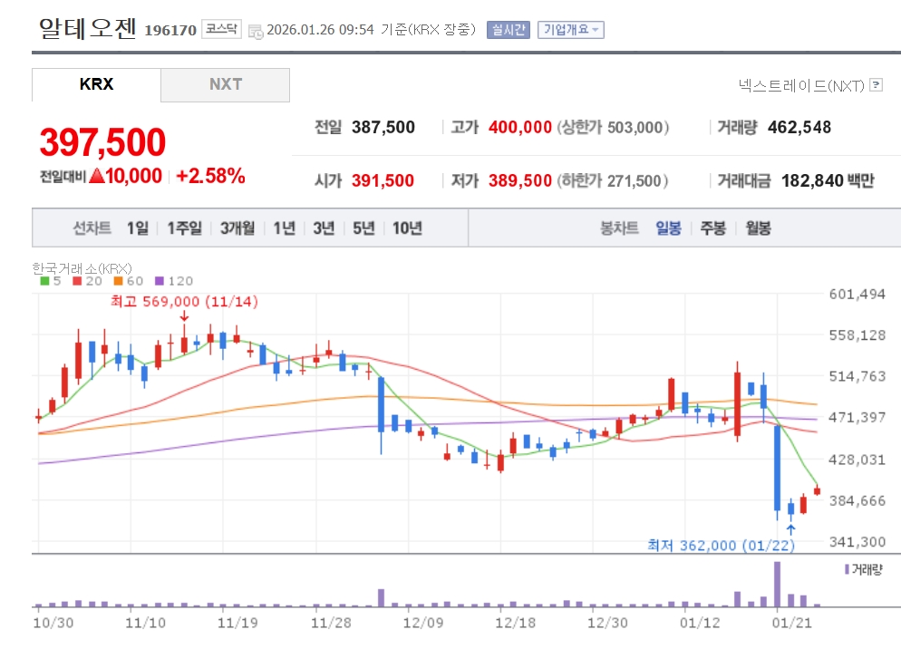 이미지 확대보기26일 한국거래소에 따르면 코스닥 시총 1위인 알테오젠은 이날 오전 9시54분 전장 대비 2.58% 상승한 39만7500원을 기록하고 있다. 지난 21일 하루 만에 20% 넘게 폭락했다가 빠르게 반등하는 모습이다. 그동안 부진했던 에코프로비엠(10.33%), 에코프로(8.50%)도 각각 10% 안팎의 상승 흐름을 보이고 있다.