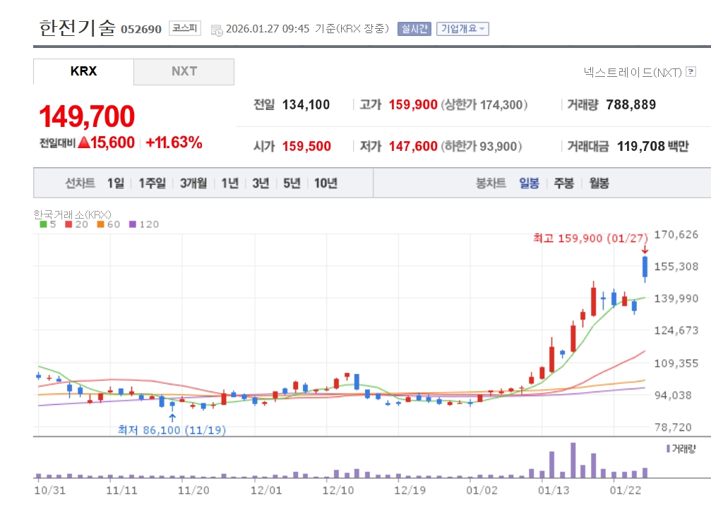 이미지 확대보기27일 한국거래소에 따르면 오전 9시 45분 현재 한전기술은 전 거래일 대비 11.63% 급등한 14만9700원에 거래되고 있다. 두산에너빌리티(3.16%), 한국전력(2.48%), 한신기계(6.84%), 비에이치아이(9.54%) 등도 상승 중이다.
