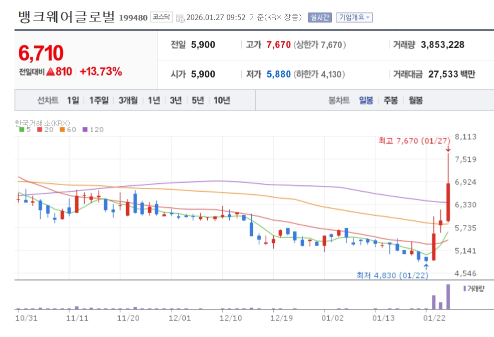 이미지 확대보기27일 한국거래소에 따르면 이날 오전 9시 52분 기준 뱅크웨어글로벌은 전 거래일 대비 13.73% 오른 6710원에 거래되고 있다.