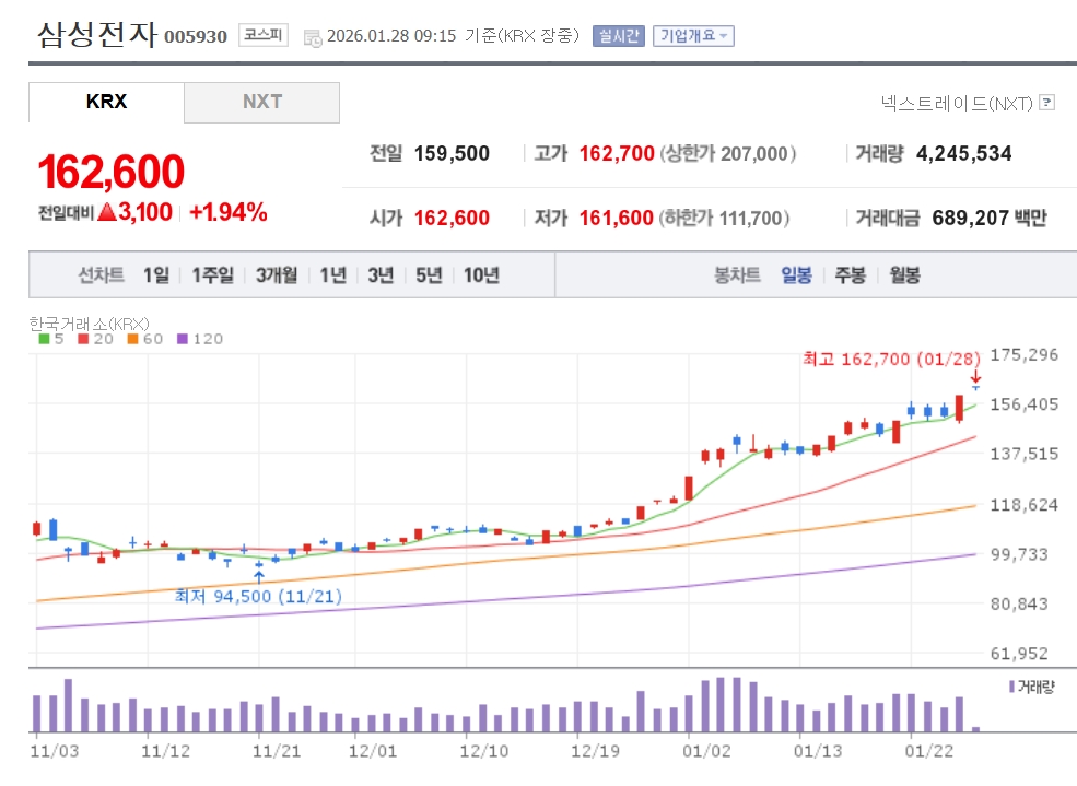 이미지 확대보기28일 한국거래소에 따르면 오전 9시15분 삼성전자는 전일 대비 1.94% 오른 16만2600원에 거래 중이다. 장중 16만2700원을 터치하며 최고가를 기록했다. 이날 '16만전자'를 첫 기록했다. SK하이닉스도 1.50% 오른 81만2000원에 거래되고 있다. 정규장 개장 초반 81만5000원까지 상승했다.