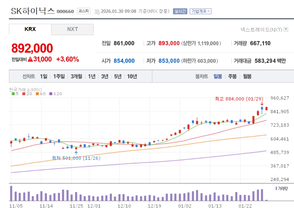 이미지 확대보기30일 한국거래소에 따르면 SK하이닉스는 이날 오전 9시08분 전일대비 3.60% 오른 89만2000원에 거래중이다. 전날 장중 88만4000원으로 최고가를 기록한 이후 단 하루만에 또다시 최고가를 경신했다.