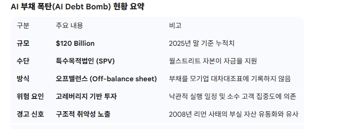 보고서가 지목한 핵심 위험 요소는 기술 기업들의 기형적인 자금 조달 방식이다. 보고서에 따르면 빅테크 기업들은 월스트리트 자본이 지원하는 특수목적법인(SPV)을 활용해 1,200억 달러 이상의 데이터센터 건립 비용을 모기업 대차대조표에서 제외하는 오프밸런스(Off-balance sheet)’ 방식을 취했다. 이러한 은닉형 조달은 2008년 금융위기 당시 부실의 씨앗이 된 구조적 취약성을 그대로 재현하고 있다는 분석이다.