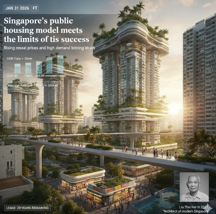파이낸셜타임스(FT)는 지난달 31(현지시각) 보도에서 싱가포르 현대 건축의 기틀을 닦은 류타이커(Liu Thai Ker) 전 주택개발청(HDB) 수석 건축가의 타계 소식을 전하며, 그가 설계한 공공주택 시스템이 60년 만에 중대한 갈림길에 섰다고 분석했다. 류 전 수석 건축가는 생전 "공공주택이 주거 안정을 넘어 비즈니스 수단으로 변질되고 있다"며 주택의 과도한 자산화를 경계해 왔다.