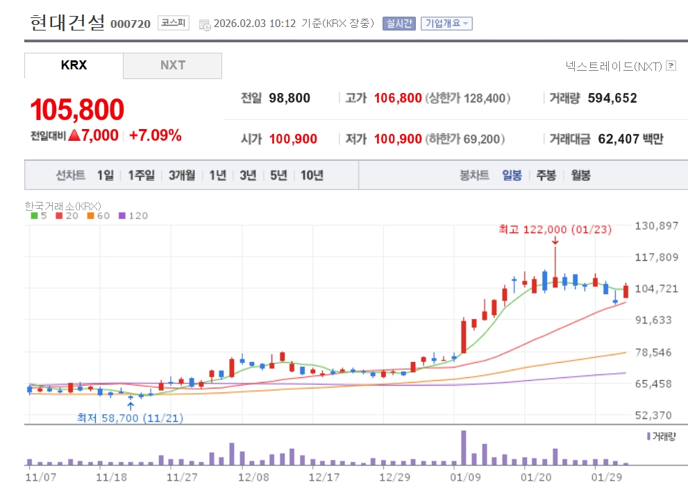 3일 한국거래소에 따르면 오전 10시 12분 기준 현대건설 주가는 전 거래일 대비 7.09% 오른 10만5800원에 거래되고 있다.