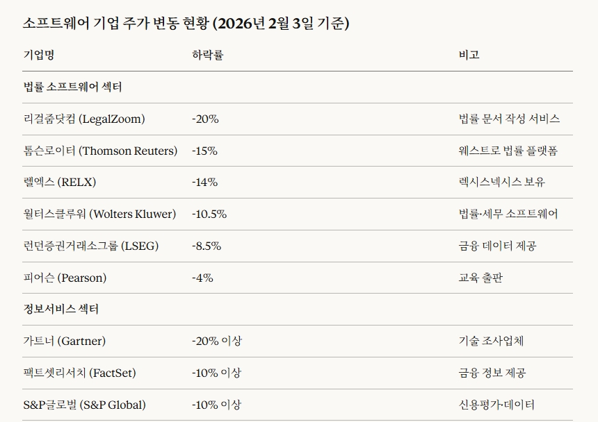 AI 공포는 법률 분야를 넘어 소프트웨어 산업 전반으로 번졌다. 블룸버그에 따르면 골드만삭스의 미국 소프트웨어 주식 바스켓은 지난 3일 6% 하락했다. 이는 지난해 4월 관세 파동 이후 가장 큰 하락폭이다. 금융서비스 기업 지수는 7% 가까이 떨어졌고, 나스닥100 지수는 1.6% 하락했다.