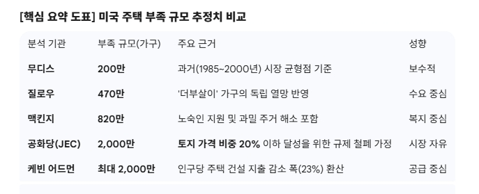 가장 극단적인 수치는 미 의회 공화당 측에서 나왔다. 의회 합동경제위원회(JEC) 소속 공화당 위원들은 2022년 보고서를 통해 미국에 약 2000만 가구의 주택이 부족하다고 주장했다. 이들은 개발자가 규제 없이 집을 지었을 때를 가정하는 '제약 없는 시장' 모델을 적용했다. 토지 가치가 주택 가격의 20%를 넘지 않는 수준까지 공급이 이루어져야 한다는 논리다.