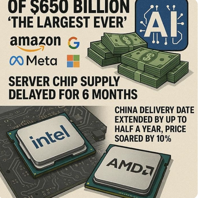 이미지 확대보기블룸버그통신은 6일(현지시각) 아마존, 구글, 메타, 마이크로소프트(MS) 등 4개 기업의 올해 설비투자가 6500억 달러(약 951조 원)에 달할 것으로 전망했다. 로이터통신은 같은 날 인텔과 AMD가 인공지능(AI) 투자 경쟁이 격화하면서 서버용 중앙처리장치(CPU)마저 공급 부족 사태를 맞아 중국 고객에게 서버 CPU 납기를 최장 6개월 연장하고, 가격도 10% 이상 올렸다고 보도했다.