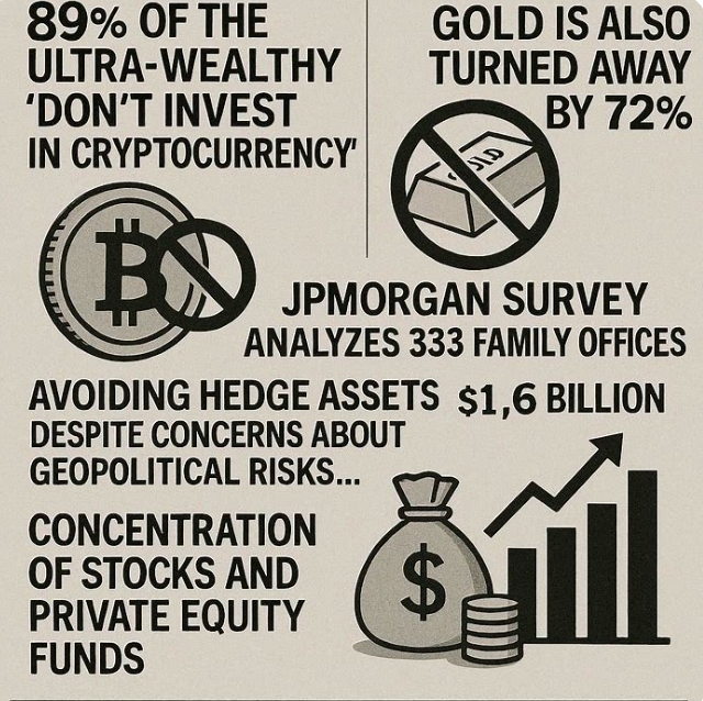 평균 자산 16억 달러(23400억 원)를 운용하는 전 세계 초부유층 투자 기구들이 지정학적 불확실성을 우려하면서도 암호화폐나 금 같은 전통 헤지 자산에는 투자하지 않는 것으로 나타났다. 배런스가 지난 6(현지시각) JP모건 프라이빗 뱅크의 2026년 글로벌 패밀리 오피스 보고서를 인용해 보도했다.
