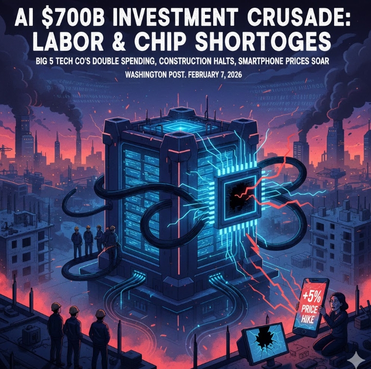 이미지 확대보기워싱턴포스트(WP)는 지난 7일(현지시간) 아마존, 구글, 마이크로소프트(MS), 메타, 오라클 등 5개 거대 기술 기업의 올해 AI 관련 투자 지출액이 7000억 달러(약 1025조 원)에 이른다고 보도했다. 이는 지난해 투자액보다 두 배 늘어난 규모로, 미국 연간 국방 예산의 4분의 3에 육박한다. 문제는 이러한 천문학적 자금이 전기기술자 등 숙련 인력과 반도체 물량을 독점하면서, 다른 산업 현장의 공사를 멈추게 하고 스마트폰을 비롯한 가전제품 가격을 끌어올리는 도미노 현상을 일으킨다는 점이다.