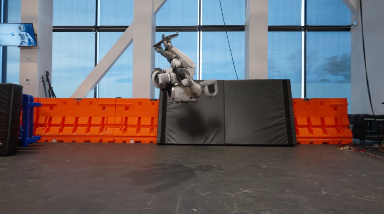 아틀라스는 도약과 공중 자세 제어, 착지 충격 흡수, 자세 회복까지의 전 과정을 끊김 없이 수행했다. 단일 동작을 넘어 연속 수행이 가능하다는 점에서 기계체조에 가까운 움직임을 구현했다는 평가가 나온다. 착지 이후에도 흔들림 없이 균형을 회복하는 장면은 전신 제어 알고리즘의 완성도를 드러냈다.