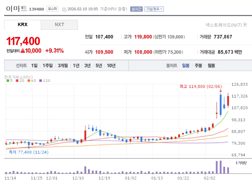 10일 한국거래소에 따르면 이날 오전 10시 05분 기준 이마트는 전 거래일 대비 9.31% 오른 11만7400원에 거래되고 있다. 롯데마트를 운영하는 롯데쇼핑도 7.19% 상승한 10만5900원에 거래 중이다. 택배사인 CJ대한통운은 전장 대비 5.47% 오른 12만3500원에 거래되고 있다.