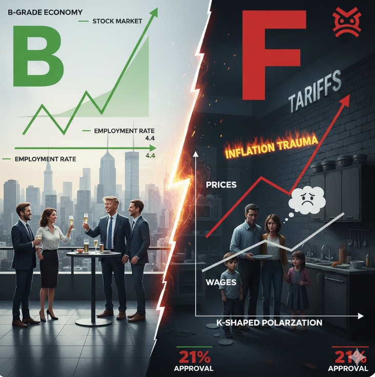 여기에 트럼프 행정부의 관세정책이 물가를 자극하고 있다는 분석이 나오면서 유권자들의 원성은 더 커지고 있다. 특정 제품 가격이 관세 탓에 오르자 대통령이 고물가 해결에 집중하지 않는다는 인식이 확산하고 있다. 트럼프 대통령은 미국 경제에 ‘A++++’ 학점을 주며 18조 달러(약 2경5900조 원) 규모의 신규 투자를 유치했다고 주장하지만, 시장 참여자들 사이에서는 "중국 한 해 국내총생산(GDP)과 맞먹는 수치를 주장하는 것은 현실성이 떨어진다"라는 냉정한 평가가 나온다. 트럼프 행정부의 경제 성적표는 지표상 ‘B’ 학점 수준임에도 본인의 정책 기조와 대중의 고물가 트라우마가 맞물리며 지지율을 갉아먹는 역설적 상황에 놓여 있다.