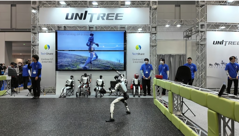 유니트리의 휴머노이드 G1이 일본 유통사 테크셰어가 주최한 부스에서 쿵푸를 시연하고 있다. 사진=유니트리