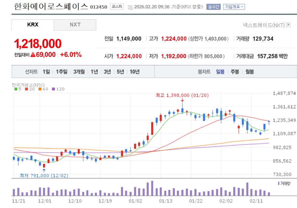 이미지 확대보기20일 한국거래소에 따르면 한화에어로스페이스는 이날 오전 9시 36분 현재 전 거래일 대비 6.01% 오른 121만 8000원에 거래되고 있다. LIG넥스원(4.86%), 현대로템(3.57%), 한국항공우주(1.37%) 등 주요 방산주도 오름세다.