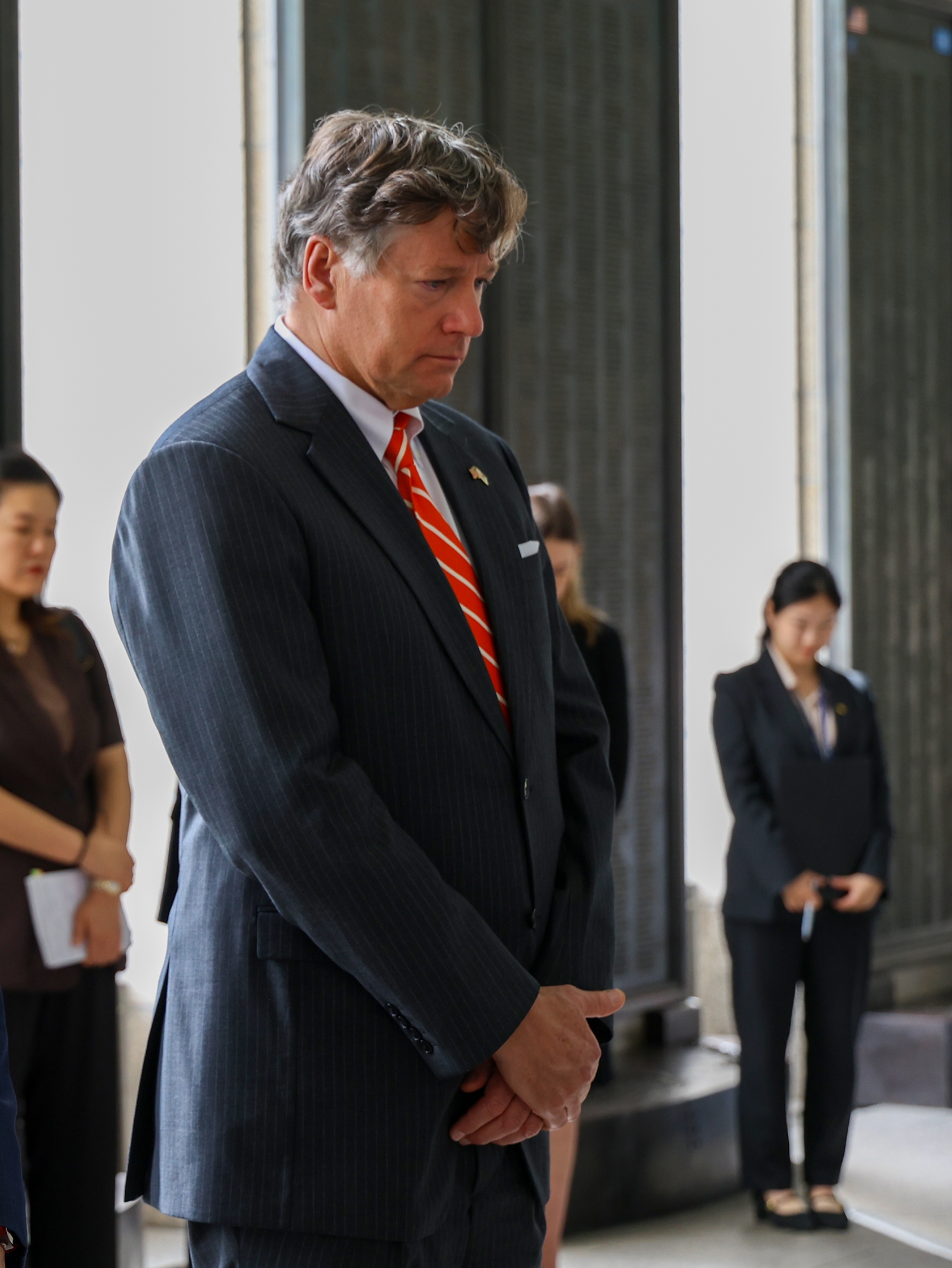 크리스토퍼 랜도 미 국무부 부장관이 지난해 9월 14일 방한 당시 서울 용산 전쟁기념관 미군 전사자 명비에 헌화한 뒤 묵념하고 있다. 사진=뉴시스이미지 확대보기