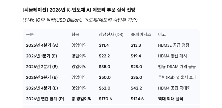 업계에서는 올해를 메모리 반도체가 전체 시장의 수익성을 견인하는 ‘슈퍼사이클’의 정점으로 보고 있다. 증권가 컨센서스에 따르면, 삼성전자와 SK하이닉스의 올해 합산 영업이익은 200조 원을 돌파할 것으로 보인다. 이는 AI 서버용 메모리의 대체재가 없는 상황에서 한국 기업들이 강력한 가격 결정권을 쥐고 있기 때문이다.