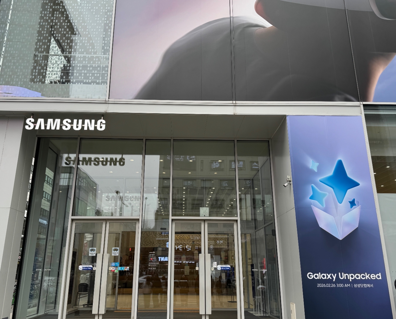 24일 삼성스토어 서울 홍대점 외벽에 26일 개막하는 갤럭시 언팩 행사 관련 포스터가 내걸려 있다. 사진=최유경 기자이미지 확대보기