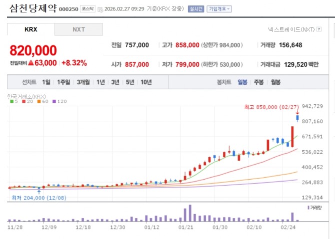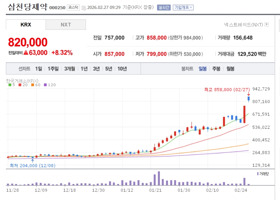 이미지 확대보기27일 한국거래소에 따르면 삼천당제약은 오전 9시 29분 기준으로 전 거래일 대비 8.32% 오른 82만원에 거래되고 있다.