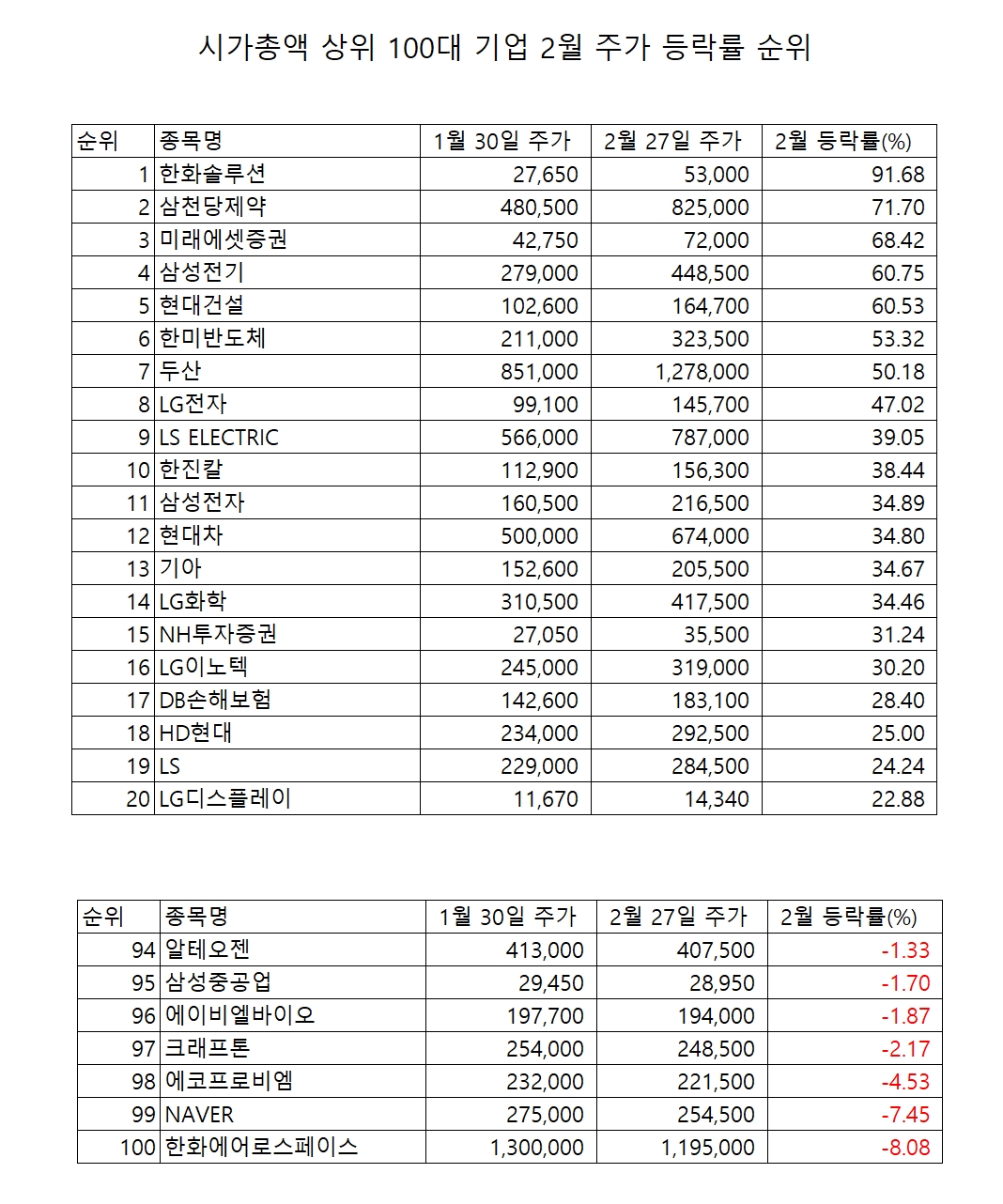 지수가 오른 달은 많았지만, 이렇게 상위 100개 기업 대부분이 동시에 몸집을 키운 사례는 흔치 않다. 2월은 숫자가 아니라 구조가 변한 달이었다.