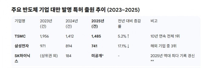 삼성전자와 SK하이닉스가 대만 특허청 출원을 집중적으로 늘리는 배경에는 단순한 기술 방어 이상의 전략이 깔려 있다는 게 업계의 판단이다. 반도체 제조 장비·소재 분야 전문가는 "TSMC를 정점에 둔 대만 공급망에서 지식재산권 없이는 기술 협력이나 공동 개발 협상에서 발언권을 얻기 어렵다"며 "지금의 출원 경쟁은 곧 내일의 공급망 지위를 결정하는 싸움"이라고 짚었다.