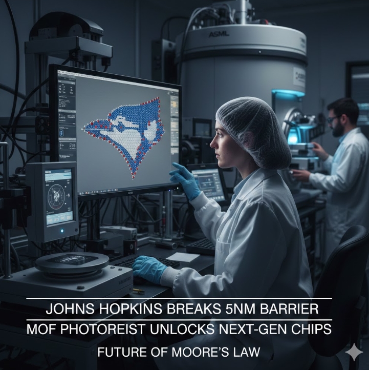 미국 존스홉킨스 대학교 마이클 차파치스(Michael Tsapatsis) 화학공학 교수와 하워드 페어브라더(Howard Fairbrother) 화학 교수 공동 연구팀은 금속 원자와 탄소 기반 유기 분자가 격자 구조로 결합한 신소재 '금속-유기 골격체(MOF·Metal-Organic Framework)'를 차세대 포토레지스트(감광액)로 활용하는 기술 개발에 성공했다. 이미지=제미나이3
