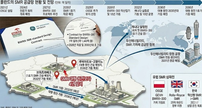 폴란드가 소형모듈원전(SMR) 분야에서 자국 대형 원전보다 4년 앞선 2030년대 초 상업 가동을 목표로 미국 GE 베르노바 히타치(GE Vernova Hitachi)와 BWRX-300 표준 설계 계약을 1억 달러(약 1440억 원)에 체결하며 유럽 SMR 시장 선점에 나섰다.