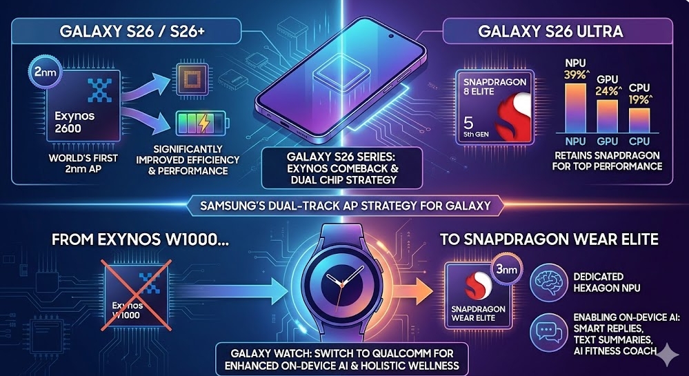 스마트폰에서 자체 칩 비중을 끌어올리는 것과 정반대로, 스마트워치에서는 이례적인 방향전환이 이뤄졌다. 삼성전자는 차세대 갤럭시 워치에 기존 '엑시노스 W1000' 대신 퀄컴의 3나노 공정 기반 스냅드래곤 웨어 엘리트(Snapdragon Wear Elite)를 채택하기로 했다.