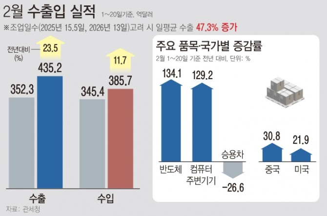 일평균 수출이 30억 달러를 넘어선 것은 이번이 처음이다. 2월 수출을 이끈 동력은 반도체다.