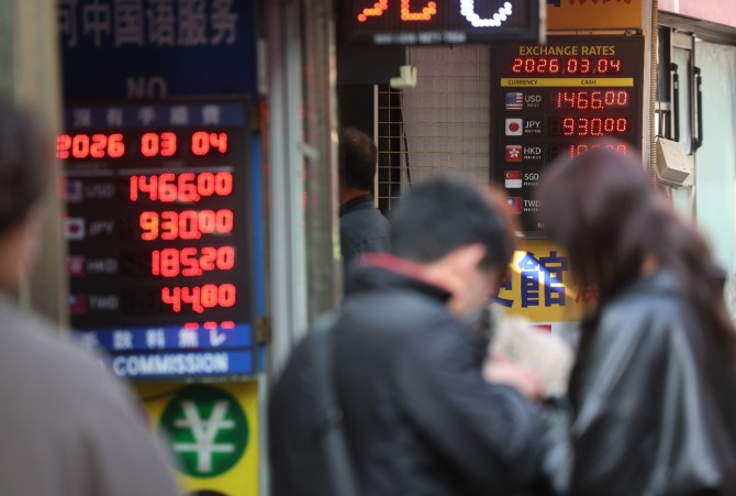 중동 사태 여파로 원·달러 환율이 무섭게 치솟은 4일 서울 명동의 환전소에 환율이 표시돼 있다. 사진=연합뉴스이미지 확대보기