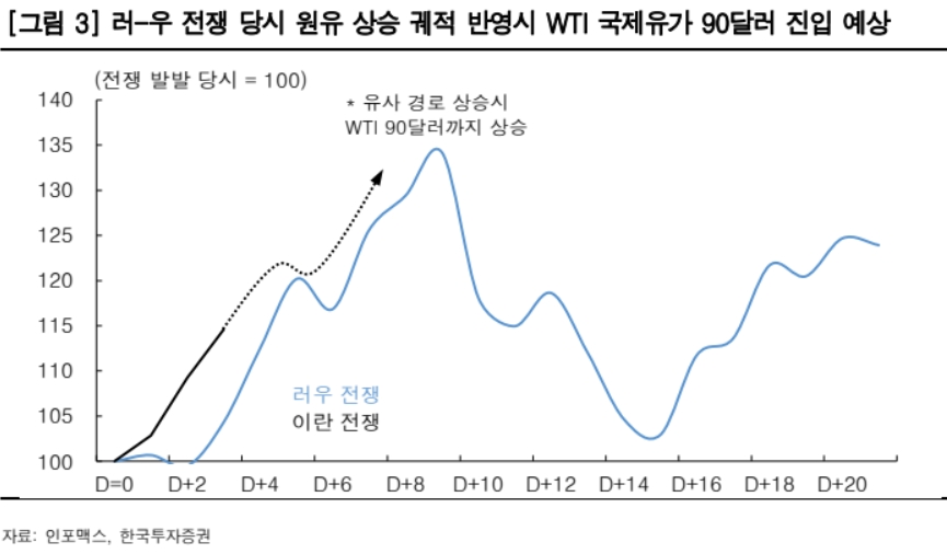 이미지 확대보기문다운 한국투자증권 연구원은 "등락 범위 상단을 1550원으로 올린 것은 서부텍사스산원유(WTI) 국제 유가가 90∼100달러까지 상승할 가능성이 있기 때문"이라며 "2022년 2월 러시아와 우크라이나 전쟁 발발 직후부터 유가가 고점까지 상승하는 데 7일이 소요, 당시 상승률은 34.2%였다"고 분석했다.