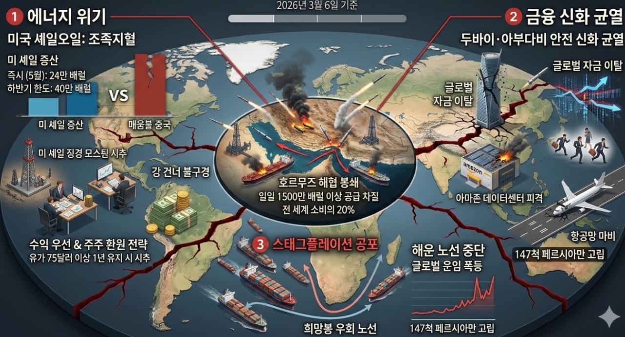 이미지 확대보기현재 세계 에너지·물류·금융 시장은 동시다발 충격에 휩싸이고 있다. 호르무즈 해협의 사실상 봉쇄로 전 세계 석유 소비량의 20%에 달하는 하루 2000만 배럴의 공급에 차질이 빚어지고 있지만, 대안으로 기대를 모았던 미국 셰일오일은 기술적 한계와 '주주 우선' 경영 전략에 발이 묶인 채 구원투수 역할을 외면하고 있다. 여기에 '중동의 금융 오아시스'로 불리던 아랍에미리트(UAE)까지 이란 미사일 사정권에 들어서면서 글로벌 자본과 전문인력이 무더기로 빠져나가는 중이다.