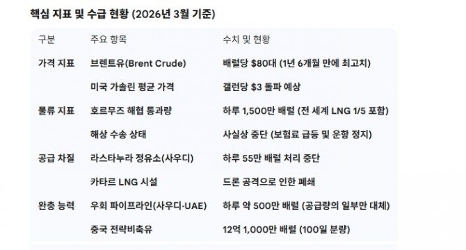 시장 참여자들은 2019년 9월 사우디 아브카이크(Abqaiq) 시설 피격 당시 세계 원유 공급량의 5%가 순식간에 사라졌던 상황을 떠올리고 있다. 당시에는 수주 내 시설이 복구됐지만, 이번에는 복수의 시설이 동시다발적으로 기능을 잃었다는 점에서 충격의 깊이가 다르다.