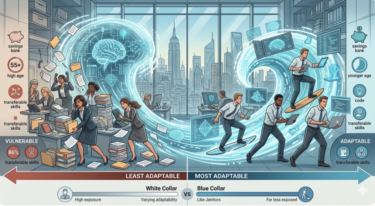AI 시대 노동시장의 핵심 질문은 '어떤 직업이 사라지는가'에서 '누가 변화를 감당하지 못하는가'로 무게중심이 이동했다. 고학력일수록 AI에 노출될 확률이 높아지는 역설적 구조 속에서, 적응 역량을 보유한 계층과 그렇지 못한 계층 사이의 간극은 새로운 형태의 계층 불평등을 만들어가고 있다.