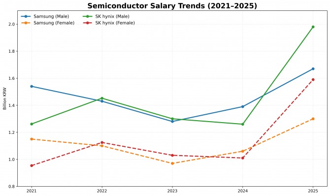 일부 구간에서는 기업 간 격차가 성별 격차를 넘어서는 모습도 확인된다. 금융감독원에 제출된 각사 사업보고서에 따르면, 2025년 기준 SK하이닉스 여성 평균임금은 1.6억원으로 삼성전자 남성 평균임금(1.7억원)에 근접했다.