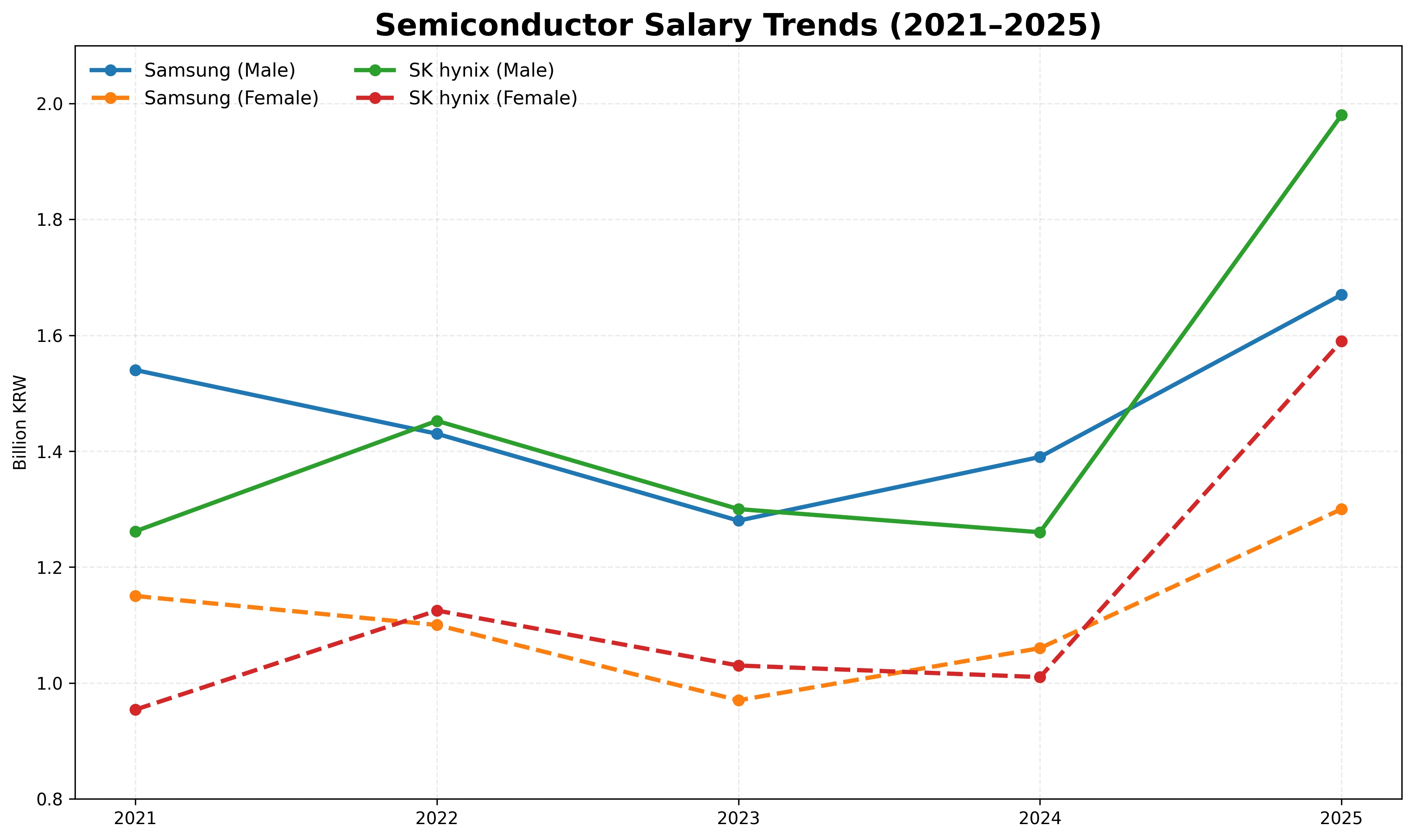 성별 임금 구조를 보면 두 회사의 흐름은 차이를 보인다. 삼성전자는 여성 임금이 남성의 약 75~78% 수준에서 완만하게 개선되는 안정적 구조를 유지한 반면, SK하이닉스는 2021년 약 75% 수준에서 2024년 80%를 넘어서며 빠르게 격차를 좁혔다. 다만 2025년에는 성과급 확대 영향으로 남성 임금 상승폭이 더 크게 나타나며 격차가 다시 확대되는 모습도 나타났다.