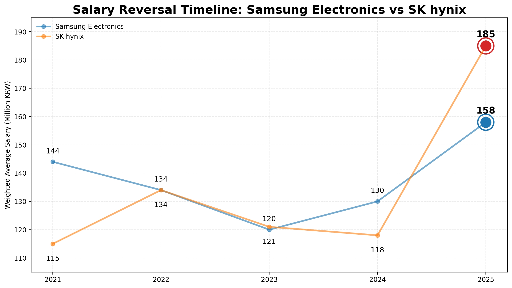 최근 AI 열풍과 HBM, D램 등 반도체 업황 호조로 반도체 '투톱' 기업의 평균임금이 큰 폭으로 상승한 가운데, 2025년 들어 SK하이닉스가 삼성전자를 앞서는 ‘연봉 역전’ 현상이 나타났다. 인공지능(AI) 반도체 호황에 따른 성과급 확대가 기업 간 보상 격차를 키운 결과로 풀이된다.