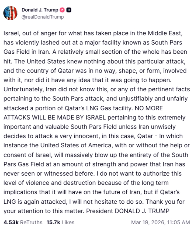 트럼프 대통령은 전날 소셜미디어에 올린 글에서 미국은 사우스파르스 공격에 관여하지 않았다고 밝히고 이스라엘이 추가 공격을 자제할 것이라고 밝혔다. 그는 이어 이란이 카타르 LNG 시설을 추가로 공격할 경우 사우스파르스 가스전을 “전면적으로 파괴할 것”이라고 경고했다.