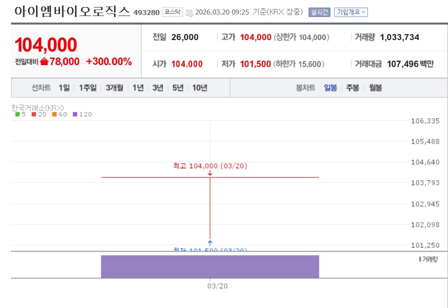 이미지 확대보기20일 한국거래소에 따르면 이날 오전 9시 25분 현재 아이엠바이오로직스는 공모가(2만6000원) 대비 300% 오른 10만4000원에 거래 중이다. 시가가 10만4000원에 형성되며 상한가로 직행했다.