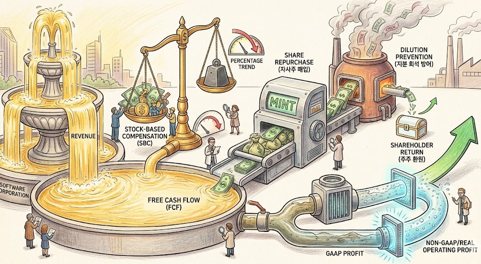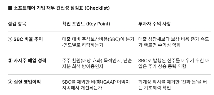 국내 투자자들이 미국 소프트웨어 기업을 분석할 때 반드시 점검해야 할 사안으로 △매출 대비 주식보상비용(SBC) 비율의 '우하향' 여부 △자사주 매입의 '진정성' SBC 제외 기준 '실질 영업이익'의 기초체력 등 세 가지 기준을 제시한다.