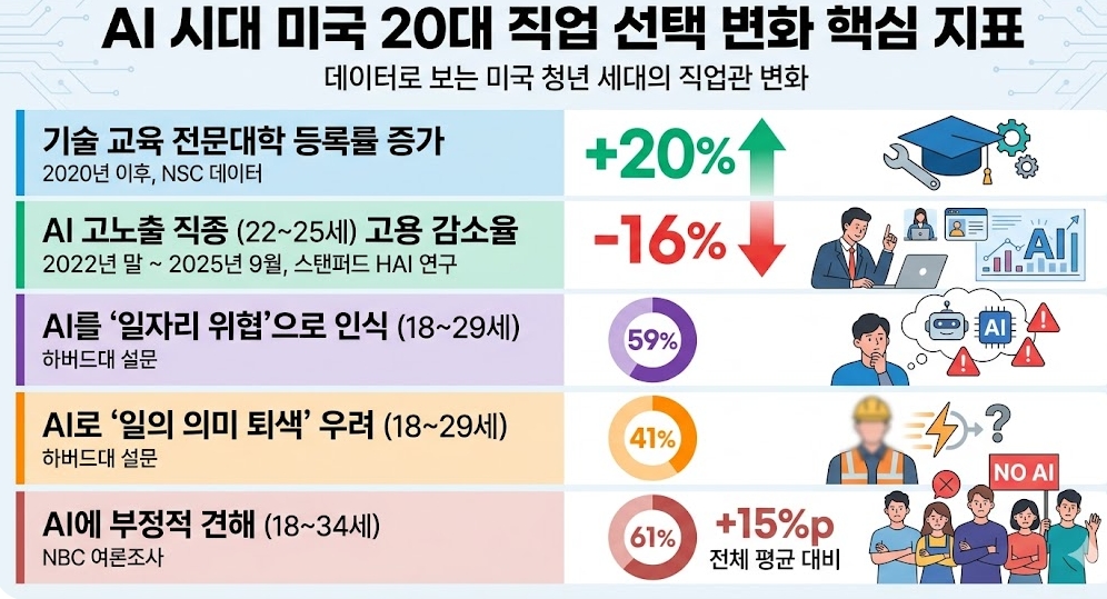 월스트리트저널(WSJ)과 스탠퍼드대 인간중심AI연구소(HAI)의 분석을 종합하면, 미국 노동 시장에서 세대교체가 아닌 '직종 교체'가 빠르게 진행되고 있다.