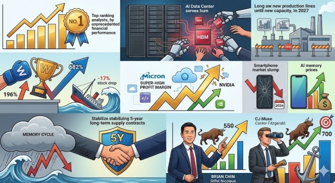 스티펠 니콜라우스(Stifel Nicolaus)의 브라이언 친 애널리스트는 "투자자들은 과거 메모리 업황 주기에서 크게 손실을 본 트라우마를 겪고 있다"면서도 "지금은 AI라는 구조적 전환점 속에서 공급 증가율 자체가 물리적으로 제한된 특수한 국면"이라고 강조했다. 그는 마이크론에 '매수' 의견과 550달러(약 82만 8600원) 목표가를 제시했다.