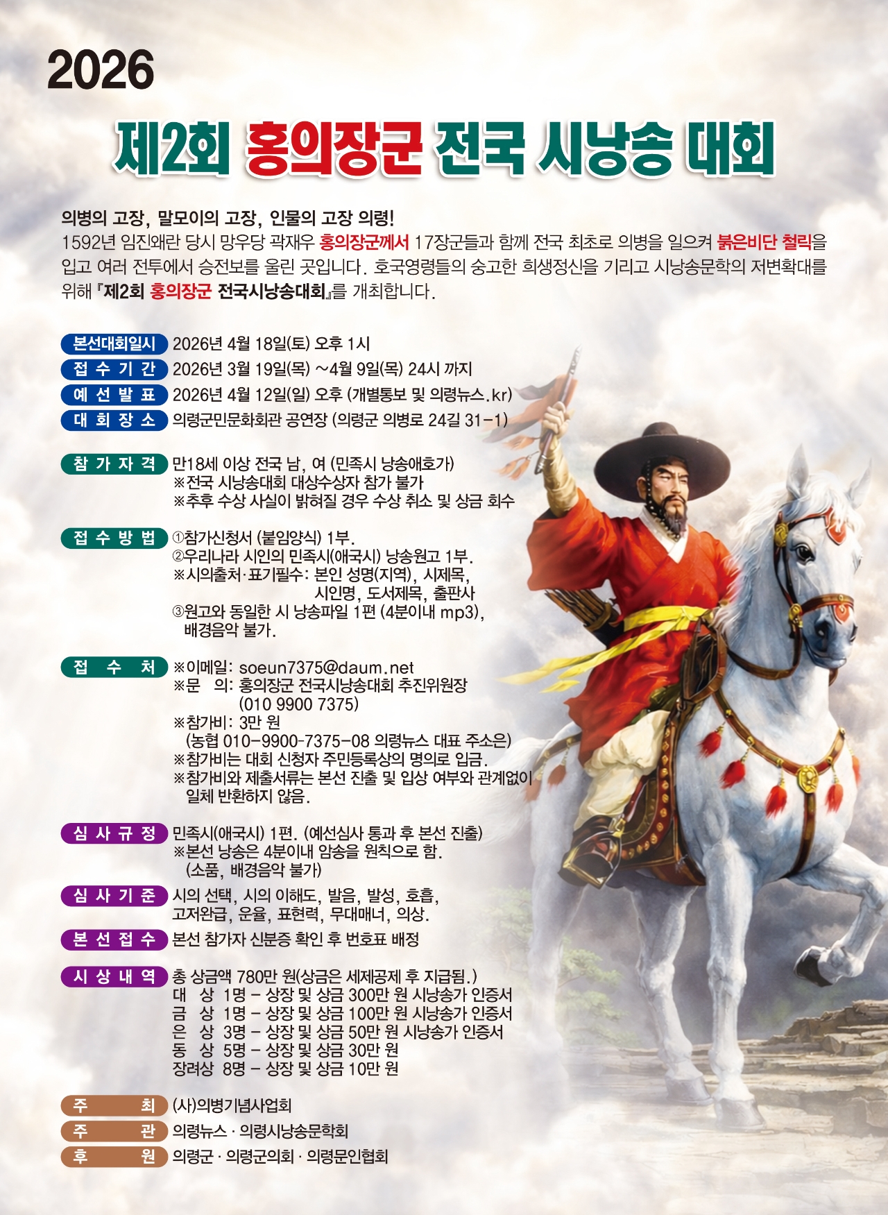 자세한 내용은 의병사업기념회 및 의령 홍의장군 전국 시낭송 추진위원회에 문의하면 된다.