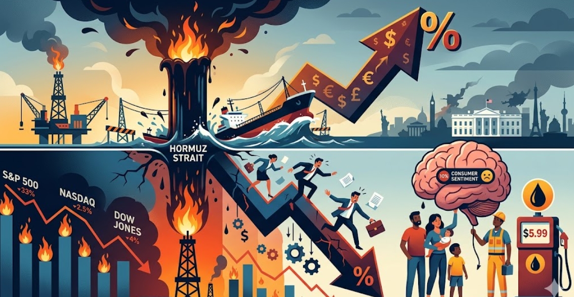 호르무즈 해협이 사실상 봉쇄 상태에 놓이면서, 국제유가는 한 달 새 배럴당 110달러(약 16만 5900원)대까지 치솟았다. 뉴욕증시는 5주 연속 하락하며 2026년 최저치를 경신했고, 소비자들의 지갑은 빠른 속도로 닫히고 있다. 이미지=제미나이3