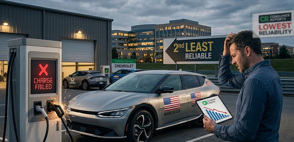 기아의 전기차 전략 모델인 EV6가 미국 시장에서 상반된 성적표를 받아 들었다. 현지 생산 비중을 80% 이상으로 끌어올리며 '가장 미국적인 전기차'로 자리매김하는 데는 성공했지만, 미국 최대 비영리 소비자단체 컨슈머리포트(Consumer Reports·CR)의 신뢰성 조사에서는 100점 만점에 25점이라는 낮은 점수로 '2026년 신뢰성 최하위 10대 차량' 2위에 이름을 올렸다. 반면 같은 CR의 주행 테스트에서는 100점 만점에 91점을 받아 최우수 전기차 중 하나로 꼽혔다. 탁월한 주행 성능과 소비자가 체감하는 품질 신뢰도 사이의 간극이 데이터로 확인된 것이다.