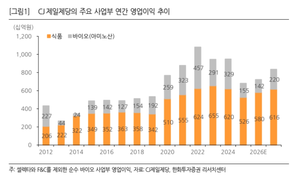 한유정 한화투자증권 연구원은 “글로벌 아미노산 시장 재편, 바이오 실적 저점 통과 가능성, 높은 해외 매출 비중, 재무구조 개선 여지를 감안해 타깃 멀티플을 상향한다”며 "글로벌 아미노산 시장의 시장 공급 질서가 재편될 가능성이 높아지는 가운데 CJ제일제당은 재무구조 개선 성과를 가시화할 경우 추가적인 재평가도 가능하다"고 전망했다.