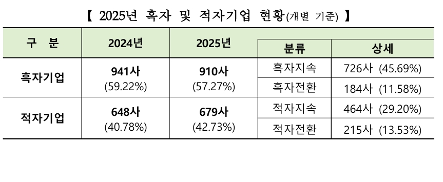 가장 뼈아픈 대목은 '적자 기업'의 비중이다. 연결 기준 1268사 중 흑자를 낸 곳은 710사(55.99%)에 불과하며, 나머지 558사(44.01%)는 적자를 기록했다. 개별 기준(1589사)으로 봐도 10곳 중 4곳 이상(42.73%)이 순이익 적자 상태다. 시장 전체의 이익 규모는 커졌지만, 정작 개별 기업들이 느끼는 온기는 차가웠다는 방증이다.