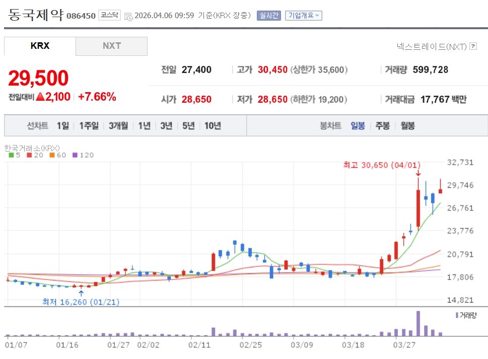 이미지 확대보기6일 한국거래소에 따르면 동국제약은 이날 오전 9시 59분 기준 전 거래일 대비 7.66% 오른 2만9500원에 거래되고 있다.